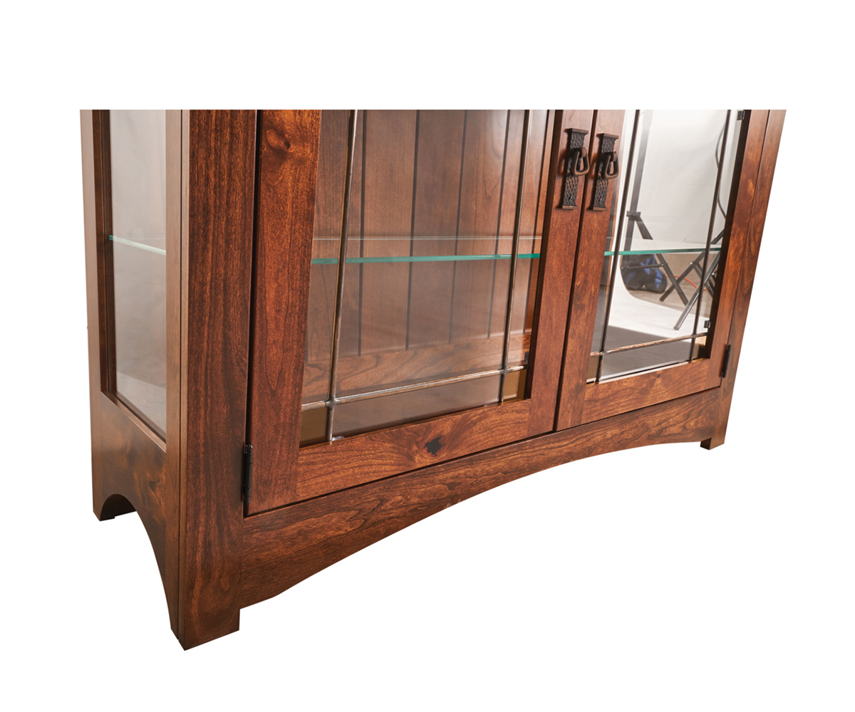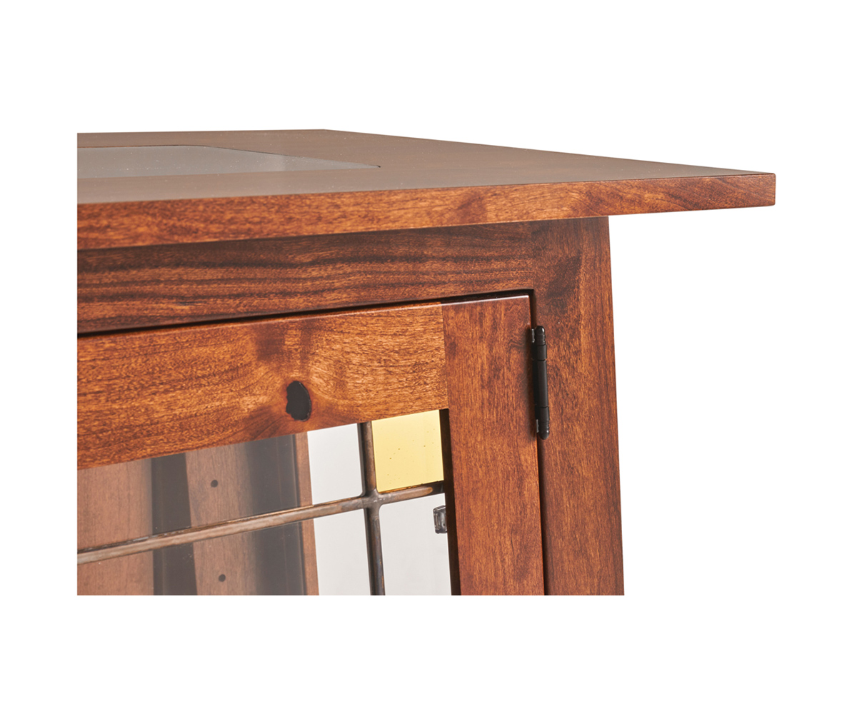 Features: • Glass top • Ship lap back • Leaded glass doors • Glass shelf behind the doors